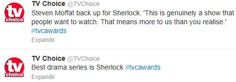 Atenção, aqui a organização dos TV Choice Awards incluiu um link para uma conta no Twitter que não pertence a Benedict Cumberbatch. Já foram prestadas desculpas oficiais. O ator não faz parte de qualquer rede social (bem como Martin Freeman).